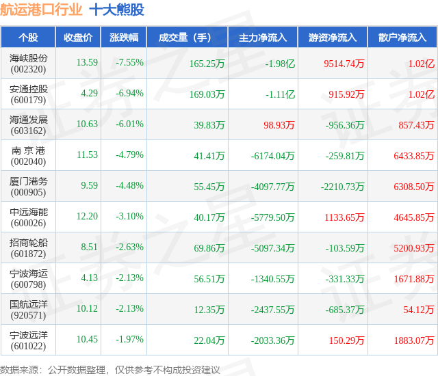 个股表现方面,航运港口行业当日领跌股为海峡股份(002320),该股当日报收13.59,下跌7.55%,成交量165.25万,主力资金净流出1.98亿元。安通控股(600179)以下跌6.94%紧随其后,该股当日成交量169.03万,主力资金净流出1.11亿元。除此之外,海通发展(603162)、南 京 港(002040)、厦门港务(000905)均进入当日熊股之列。具体个股列表见下表: