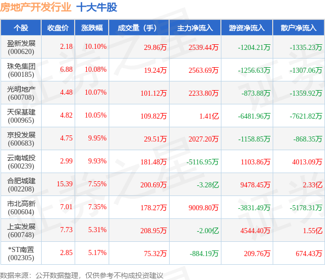 个股表现方面,房地产开发行业当日领涨股为盈新发展(000620),该股当日报收2.18,上涨10.1%,成交量29.86万,主力资金净流入2539.44万元。珠免集团(600185)以上涨10.08%紧随其后,该股当日成交量19.24万,主力资金净流入2563.69万元。除此之外,光明地产(600708)、天保基建(000965)、京投发展(600683)均进入当日牛股之列。具体个股列表见下表: