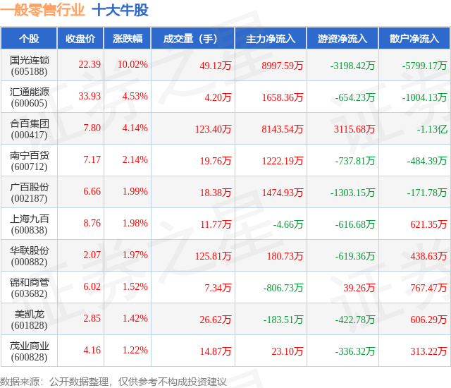 个股表现方面,一般零售行业当日领涨股为国光连锁(605188),该股当日报收22.39,上涨10.02%,成交量49.12万,主力资金净流入8997.59万元。汇通能源(600605)以上涨4.53%紧随其后,该股当日成交量4.2万,主力资金净流入1658.36万元。除此之外,合百集团(000417)、南宁百货(600712)、广百股份(002187)均进入当日牛股之列。具体个股列表见下表: