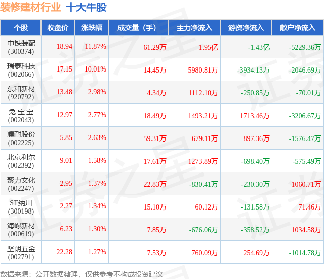 个股表现方面,装修建材行业当日领涨股为中铁装配(300374),该股当日报收18.94,上涨11.87%,成交量61.29万,主力资金净流入1.95亿元。瑞泰科技(002066)以上涨10.01%紧随其后,该股当日成交量14.45万,主力资金净流入5980.81万元。除此之外,东和新材(920792)、兔 宝 宝(002043)、濮耐股份(002225)均进入当日牛股之列。具体个股列表见下表: