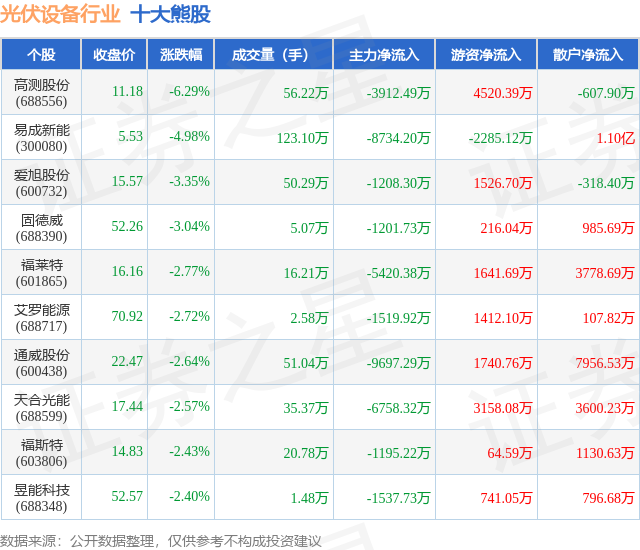 个股表现方面,光伏设备行业当日领跌股为高测股份(688556),该股当日报收11.18,下跌6.29%,成交量56.22万,主力资金净流出3912.49万元。易成新能(300080)以下跌4.98%紧随其后,该股当日成交量123.1万,主力资金净流出8734.2万元。除此之外,爱旭股份(600732)、固德威(688390)、福莱特(601865)均进入当日熊股之列。具体个股列表见下表: