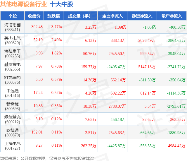 个股表现方面,其他电源设备行业当日领涨股为海博思创(688411),该股当日报收302.48,上涨3.77%,成交量3.25万,主力资金净流入1.09亿元。英杰电气(300820)以上涨2.49%紧随其后,该股当日成交量6.13万,主力资金净流入838.13万元。除此之外,海陆重工(002255)、融发核电(002366)、ST易事特(300376)均进入当日牛股之列。具体个股列表见下表: