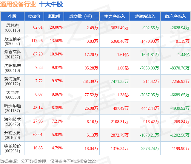 个股表现方面,通用设备行业当日领涨股为思林杰(688115),该股当日报收62.81,上涨20.0%,成交量2.49万,主力资金净流入3621.49万元。万达轴承(920002)以上涨13.5%紧随其后,该股当日成交量3.83万,主力资金净流入5368.48万元。除此之外,鼎泰高科(301377)、沈阳机床(000410)、黄河旋风(600172)均进入当日牛股之列。具体个股列表见下表: