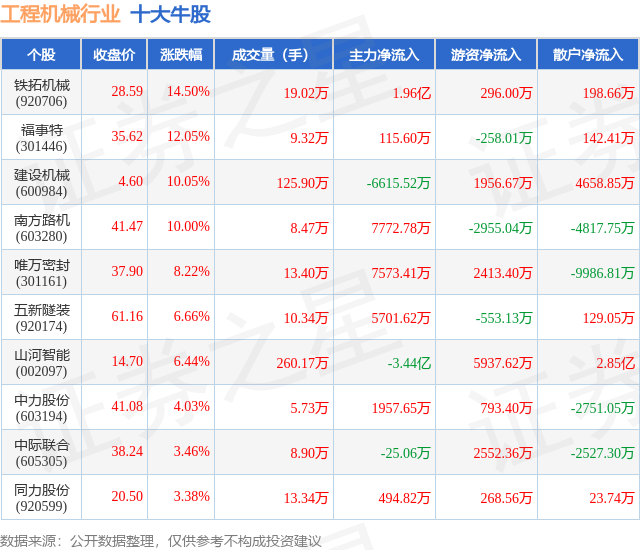 个股表现方面,工程机械行业当日领涨股为铁拓机械(920706),该股当日报收28.59,上涨14.5%,成交量19.02万,主力资金净流入1.96亿元。福事特(301446)以上涨12.05%紧随其后,该股当日成交量9.32万,主力资金净流入115.6万元。除此之外,建设机械(600984)、南方路机(603280)、唯万密封(301161)均进入当日牛股之列。具体个股列表见下表: