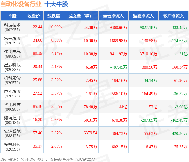 个股表现方面,自动化设备行业当日领涨股为科瑞技术(002957),该股当日报收22.44,上涨10.0%,成交量44.08万,主力资金净流入9360.66万元。常辅股份(920396)以上涨6.53%紧随其后,该股当日成交量10.0万,主力资金净流入1669.98万元。除此之外,伟创电气(688698)、星辰科技(920885)、机科股份(920579)均进入当日牛股之列。具体个股列表见下表: