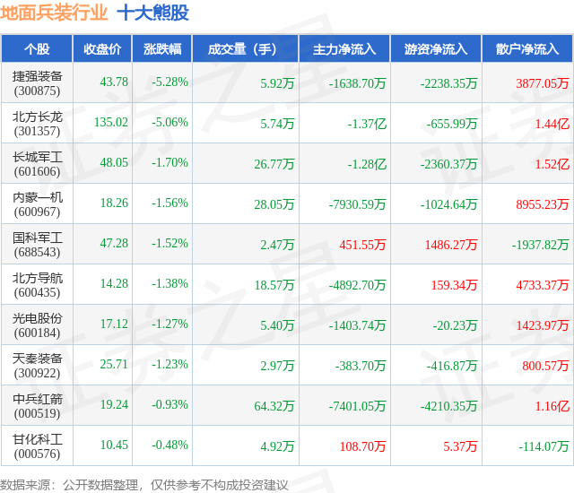 个股表现方面,地面兵装行业当日领跌股为捷强装备(300875),该股当日报收43.78,下跌5.28%,成交量5.92万,主力资金净流出1638.7万元。北方长龙(301357)以下跌5.06%紧随其后,该股当日成交量5.74万,主力资金净流出1.37亿元。除此之外,长城军工(601606)、内蒙一机(600967)、国科军工(688543)均进入当日熊股之列。具体个股列表见下表: