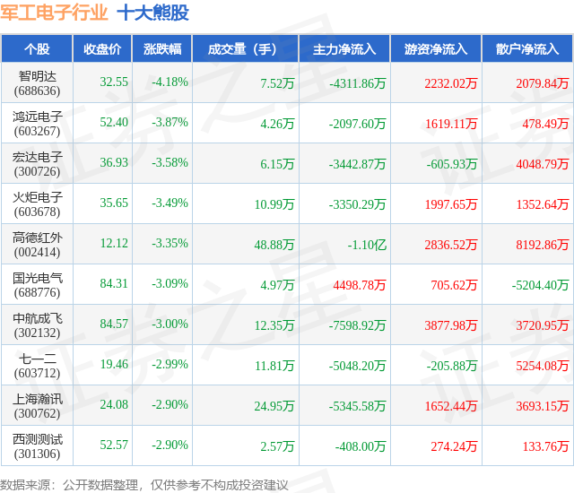 个股表现方面,军工电子行业当日领跌股为智明达(688636),该股当日报收32.55,下跌4.18%,成交量7.52万,主力资金净流出4311.86万元。鸿远电子(603267)以下跌3.87%紧随其后,该股当日成交量4.26万,主力资金净流出2097.6万元。除此之外,宏达电子(300726)、火炬电子(603678)、高德红外(002414)均进入当日熊股之列。具体个股列表见下表: