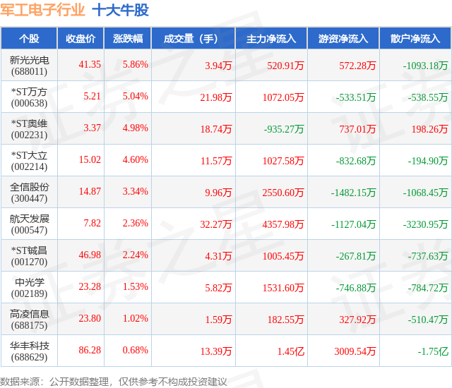 个股表现方面,军工电子行业当日领涨股为新光光电(688011),该股当日报收41.35,上涨5.86%,成交量3.94万,主力资金净流入520.91万元。*ST万方(000638)以上涨5.04%紧随其后,该股当日成交量21.98万,主力资金净流入1072.05万元。除此之外,*ST奥维(002231)、*ST大立(002214)、全信股份(300447)均进入当日牛股之列。具体个股列表见下表: