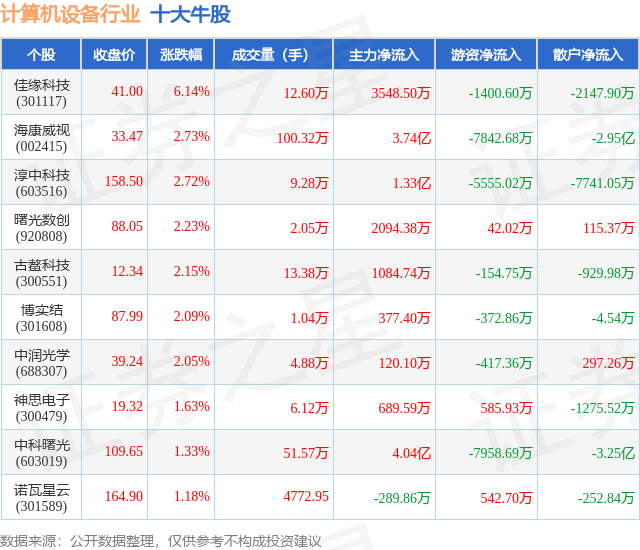 个股表现方面,计算机设备行业当日领涨股为佳缘科技(301117),该股当日报收41.0,上涨6.14%,成交量12.6万,主力资金净流入3548.5万元。海康威视(002415)以上涨2.73%紧随其后,该股当日成交量100.32万,主力资金净流入3.74亿元。除此之外,淳中科技(603516)、曙光数创(920808)、古鳌科技(300551)均进入当日牛股之列。具体个股列表见下表: