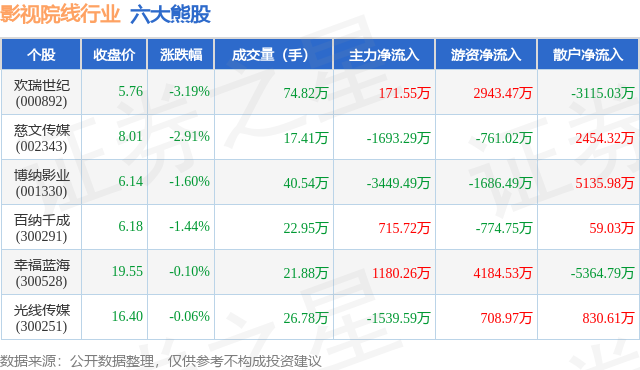 个股表现方面,影视院线行业当日领跌股为欢瑞世纪(000892),该股当日报收5.76,下跌3.19%,成交量74.82万,主力资金净流入171.55万元。慈文传媒(002343)以下跌2.91%紧随其后,该股当日成交量17.41万,主力资金净流出1693.29万元。除此之外,博纳影业(001330)、百纳千成(300291)、幸福蓝海(300528)均进入当日熊股之列。具体个股列表见下表: