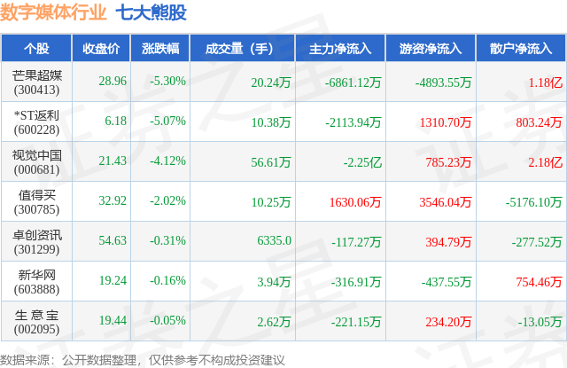 个股表现方面,数字媒体行业当日领跌股为芒果超媒(300413),该股当日报收28.96,下跌5.3%,成交量20.24万,主力资金净流出6861.12万元。*ST返利(600228)以下跌5.07%紧随其后,该股当日成交量10.38万,主力资金净流出2113.94万元。除此之外,视觉中国(000681)、值得买(300785)、卓创资讯(301299)均进入当日熊股之列。具体个股列表见下表: