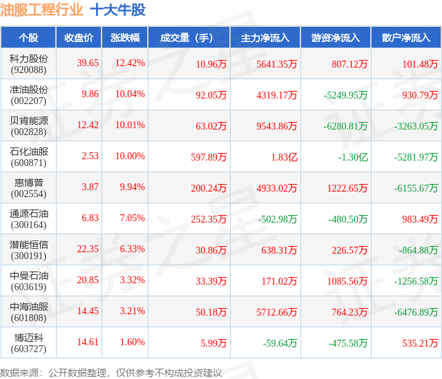 个股表现方面,油服工程行业当日领涨股为科力股份(920088),该股当日报收39.65,上涨12.42%,成交量10.96万,主力资金净流入5641.35万元。准油股份(002207)以上涨10.04%紧随其后,该股当日成交量92.05万,主力资金净流入4319.17万元。除此之外,贝肯能源(002828)、石化油服(600871)、惠博普(002554)均进入当日牛股之列。具体个股列表见下表: