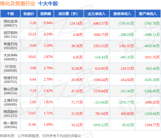 个股表现方面,炼化及贸易行业当日领涨股为茂化实华(000637),该股当日报收5.2,上涨9.94%,成交量124.14万,主力资金净流入4463.37万元。润贝航科(001316)以上涨4.14%紧随其后,该股当日成交量4.48万,主力资金净流入1666.75万元。除此之外,荣盛石化(002493)、大庆华科(000985)、ST沈化(000698)均进入当日牛股之列。具体个股列表见下表: