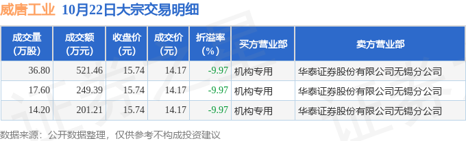 证券之星消息,10月22日威唐工业发生大宗交易,交易数据如下: