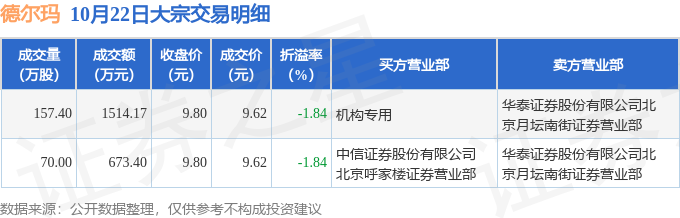 证券之星消息,10月22日德尔玛发生大宗交易,交易数据如下: