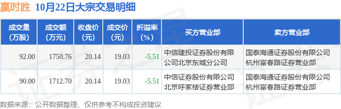 证券之星消息,10月22日赢时胜发生大宗交易,交易数据如下: