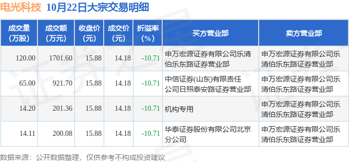 证券之星消息,10月22日电光科技发生大宗交易,交易数据如下: