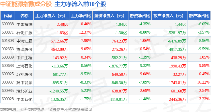 资金流向方面,中证能源(000928)指数成份股当日主力资金净流出合计4.8亿元,游资资金净流出合计1861.89万元,散户资金净流入合计4.99亿元。成份股资金流向详情见下表: