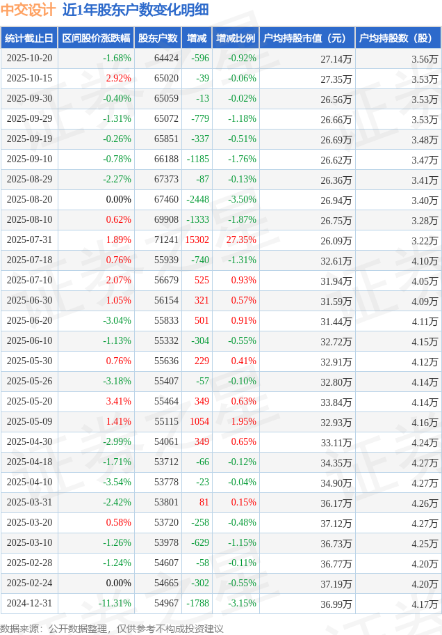 从股价来看,2025年10月15日至2025年10月20日,中交设计区间跌幅为1.68%,在此期间股东户数减少596.0户,减幅为0.92%。