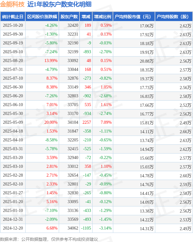 从股价来看,2025年9月30日至2025年10月20日,金能科技区间跌幅为4.26%,在此期间股东户数增加189.0户,增幅为0.59%。