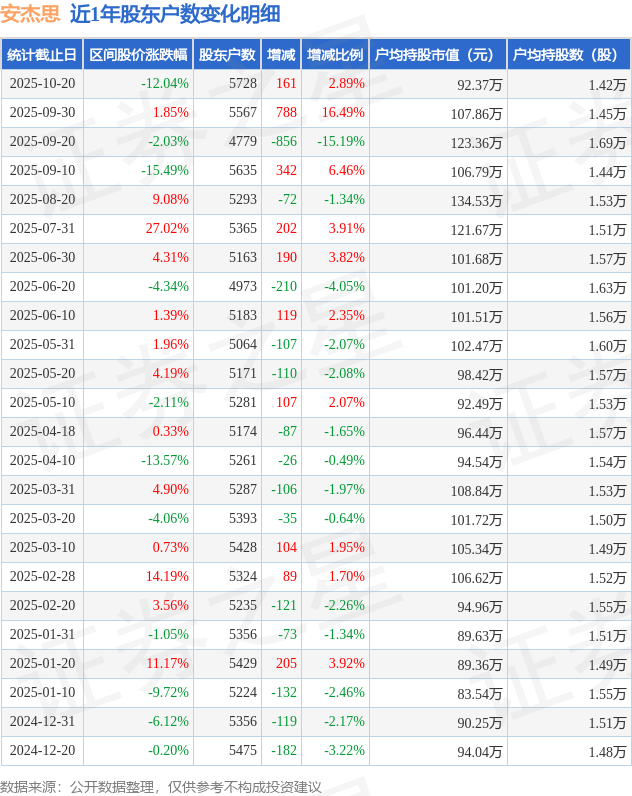 证券之星消息,近日安杰思披露,截至2025年10月20日公司股东户数为5728.0户,较9月30日增加161.0户,增幅为2.89%。户均持股数量由上期的1.45万股减少至1.42万股,户均持股市值为92.37万元。