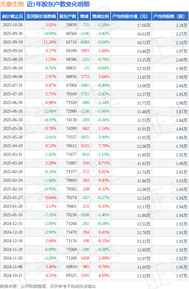 证券之星消息,近日天康生物披露,截至2025年10月20日公司股东户数为5.98万户,较9月30日减少725.0户,减幅为1.2%。户均持股数量由上期的2.25万股增加至2.28万股,户均持股市值为17.66万元。