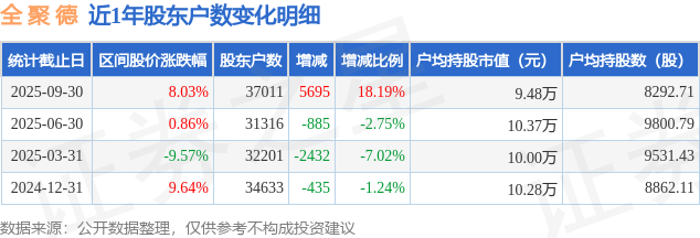 从股价来看,2025年6月30日至2025年9月30日,全 聚 德区间涨幅为8.03%,在此期间股东户数增加5695.0户,增幅为18.19%。