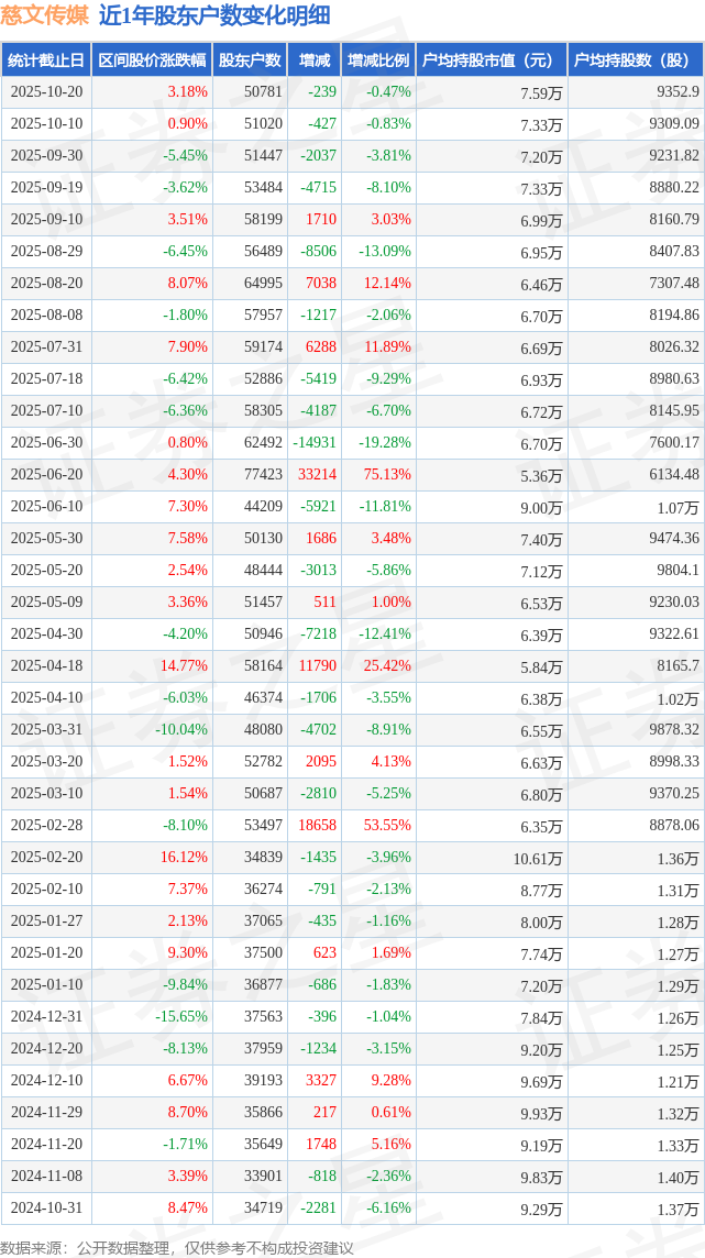 从股价来看,2025年10月10日至2025年10月20日,慈文传媒区间涨幅为3.18%,在此期间股东户数减少239.0户,减幅为0.47%。