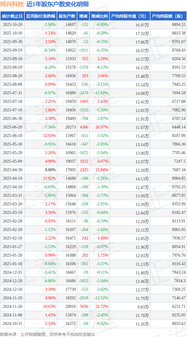 从股价来看,2025年10月10日至2025年10月20日,同兴科技区间跌幅为2.9%,在此期间股东户数减少132.0户,减幅为0.89%。