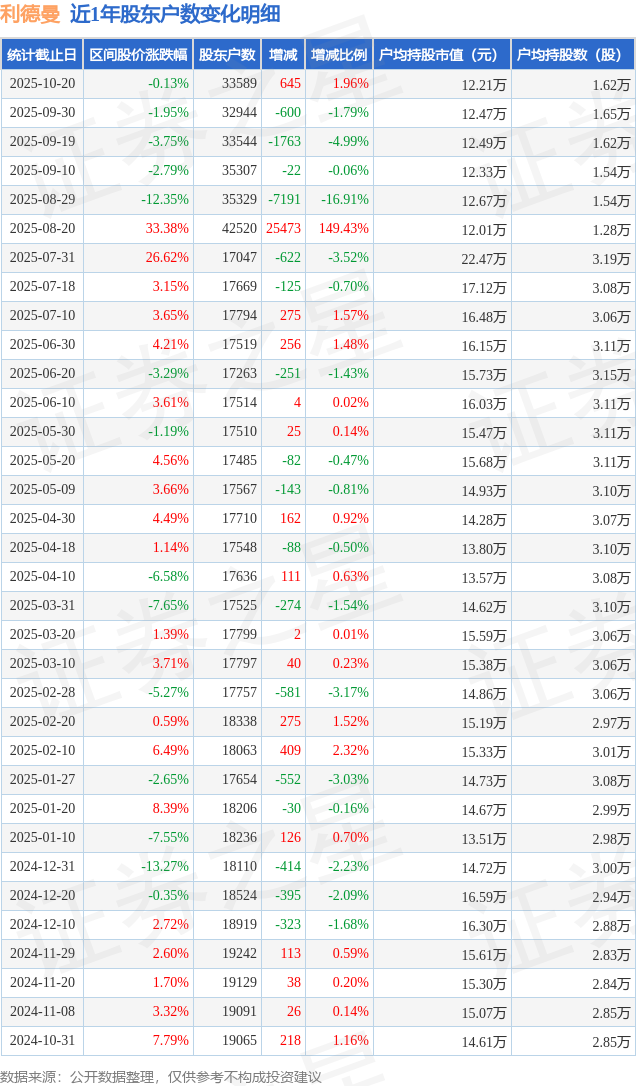 从股价来看,2025年9月30日至2025年10月20日,利德曼区间跌幅为0.13%,在此期间股东户数增加645.0户,增幅为1.96%。