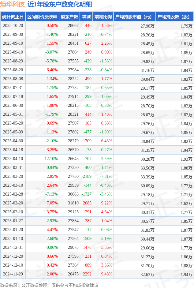 从股价来看,2025年9月30日至2025年10月20日,炬华科技区间涨幅为0.58%,在此期间股东户数增加446.0户,增幅为1.58%。