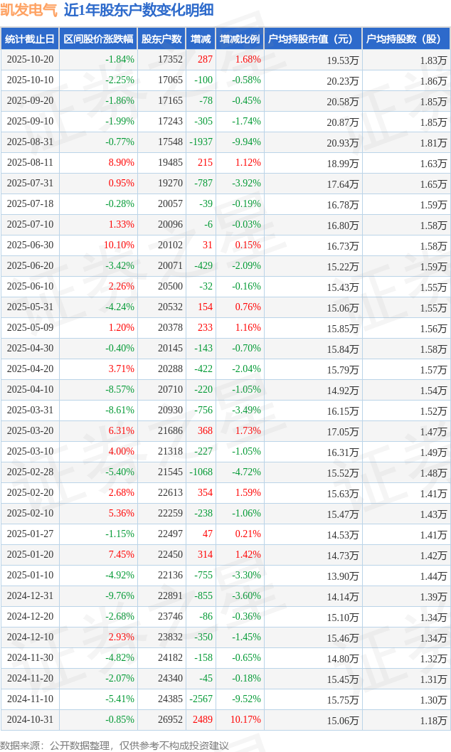 从股价来看,2025年10月10日至2025年10月20日,凯发电气区间跌幅为1.84%,在此期间股东户数增加287.0户,增幅为1.68%。