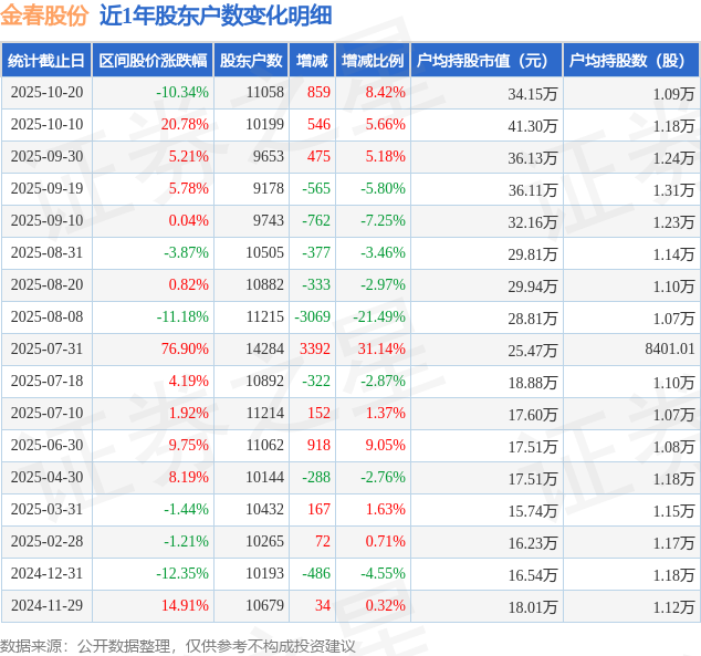 从股价来看,2025年10月10日至2025年10月20日,金春股份区间跌幅为10.34%,在此期间股东户数增加859.0户,增幅为8.42%。