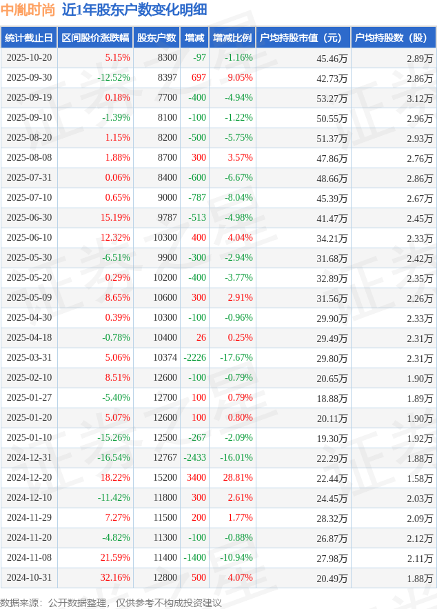 证券之星消息,近日中胤时尚披露,截至2025年10月20日公司股东户数为8300.0户,较9月30日减少100.0户,减幅为1.19%。户均持股数量由上期的2.86万股增加至2.89万股,户均持股市值为45.46万元。