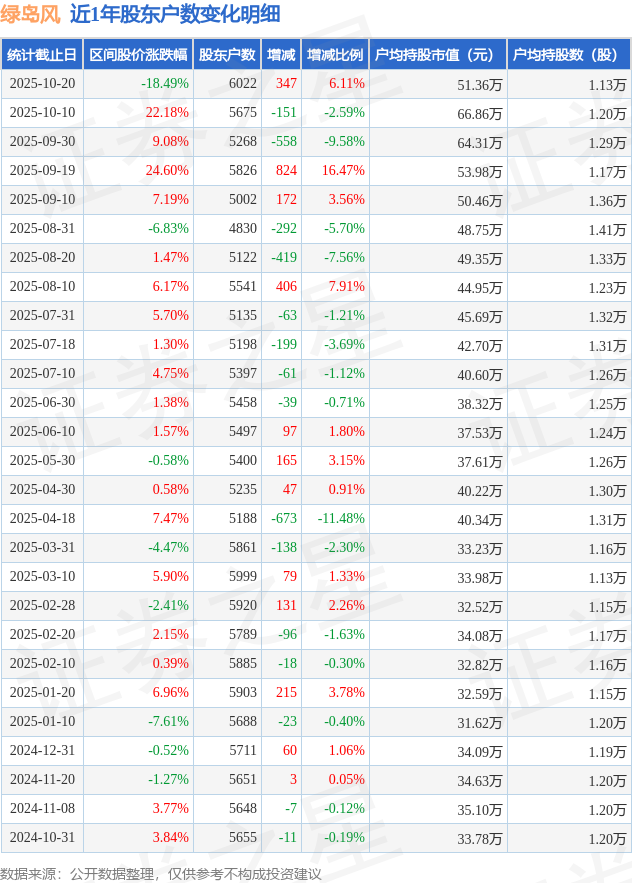 从股价来看,2025年10月10日至2025年10月20日,绿岛风区间跌幅为18.49%,在此期间股东户数增加347.0户,增幅为6.11%。