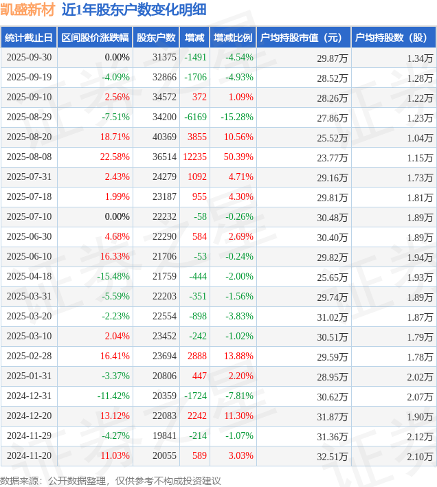 从股价来看,2025年9月19日至2025年9月30日,凯盛新材区间跌幅为0.0%,在此期间股东户数减少1491.0户,减幅为4.54%。