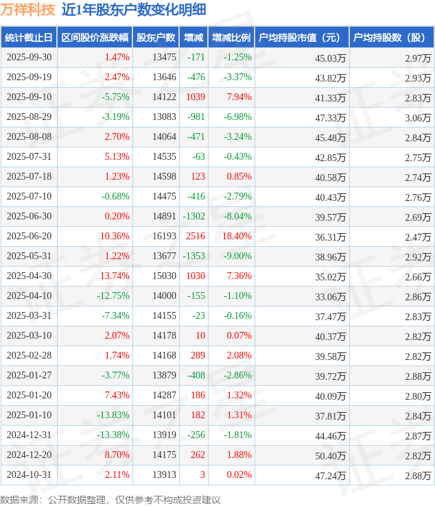 从股价来看,2025年9月19日至2025年9月30日,万祥科技区间涨幅为1.47%,在此期间股东户数减少171.0户,减幅为1.25%。