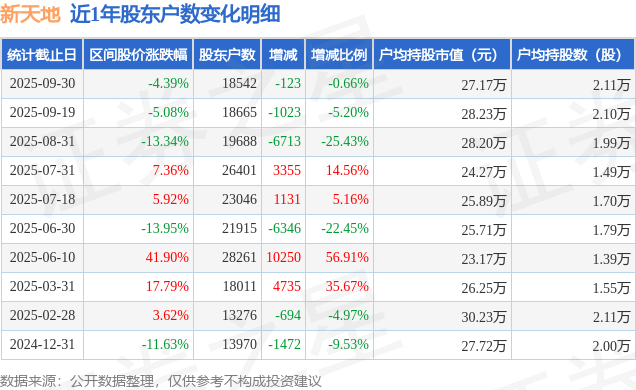 从股价来看,2025年9月19日至2025年9月30日,新天地区间跌幅为4.39%,在此期间股东户数减少123.0户,减幅为0.66%。