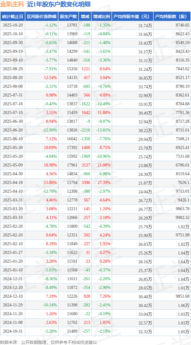 从股价来看,2025年10月10日至2025年10月20日,金凯生科区间跌幅为1.12%,在此期间股东户数减少188.0户,减幅为1.35%。