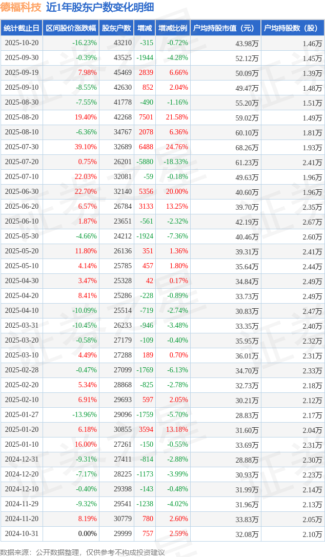从股价来看,2025年9月30日至2025年10月20日,德福科技区间跌幅为16.23%,在此期间股东户数减少315.0户,减幅为0.72%。