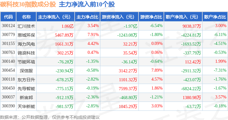 资金流向方面,碳科技30(399030)指数成份股当日主力资金净流出合计27.64亿元,游资资金净流入合计4.47亿元,散户资金净流入合计23.17亿元。成份股资金流向详情见下表: