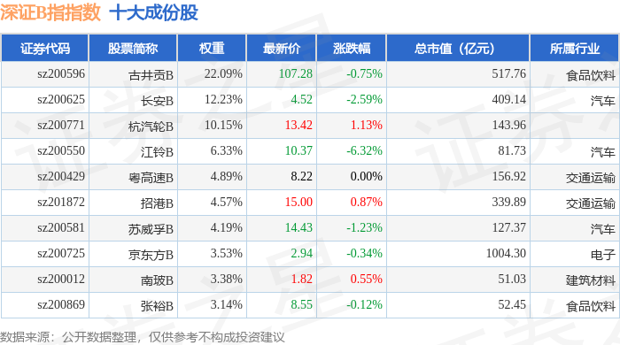 资金流向方面,深证B指(399108)指数成份股当日主力资金净流出合计1924.99万元,游资资金净流入合计540.23万元,散户资金净流入合计1384.76万元。成份股资金流向详情见下表:
