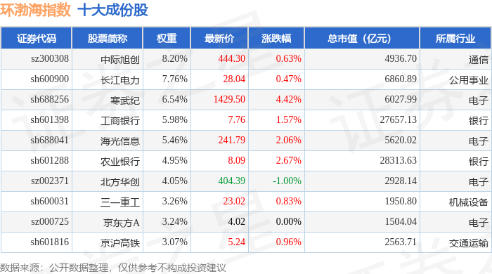 环渤海(399357)指数十大成份股详情如下:
