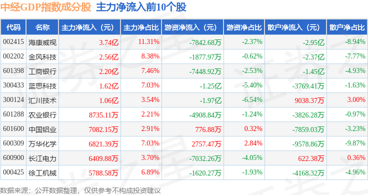 资金流向方面,中经GDP(399399)指数成份股当日主力资金净流出合计111.81亿元,游资资金净流入合计42.86亿元,散户资金净流入合计68.95亿元。成份股资金流向详情见下表: