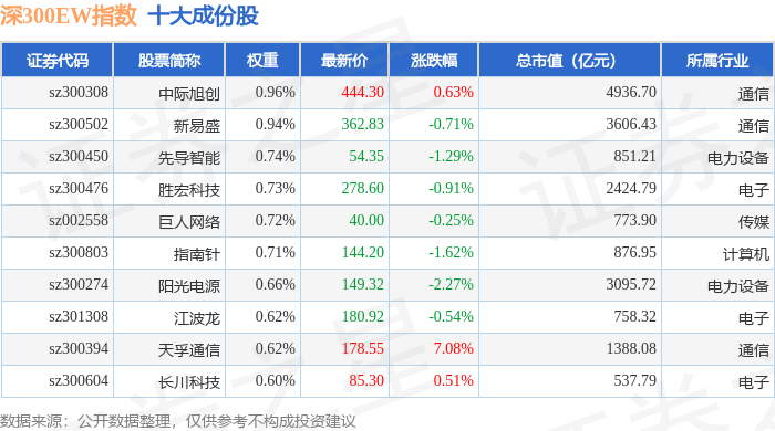 证券之星消息,10月22日,深300EW(399633)指数报收于5961.86点,跌0.76%,成交3283.73亿元,换手率1.19%。当日该指数成份股中,上涨的有81家,天孚通信以7.08%的涨幅领涨,下跌的有211家,锐捷网络以9.67%的跌幅领跌。