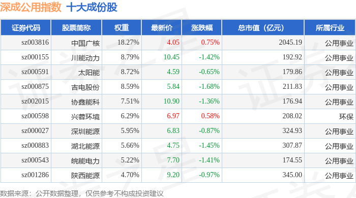 证券之星消息,10月22日,深成公用(399689)指数报收于861.96点,跌0.57%,成交30.63亿元,换手率0.62%。当日该指数成份股中,上涨的有2家,中国广核以0.75%的涨幅领涨,下跌的有13家,吉电股份以1.68%的跌幅领跌。
