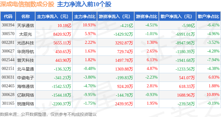资金流向方面,深成电信(399688)指数成份股当日主力资金净流出合计12.19亿元,游资资金净流入合计8.43亿元,散户资金净流入合计3.76亿元。成份股资金流向详情见下表: