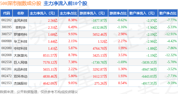 资金流向方面,500深市(399802)指数成份股当日主力资金净流出合计64.95亿元,游资资金净流入合计22.23亿元,散户资金净流入合计42.72亿元。成份股资金流向详情见下表: