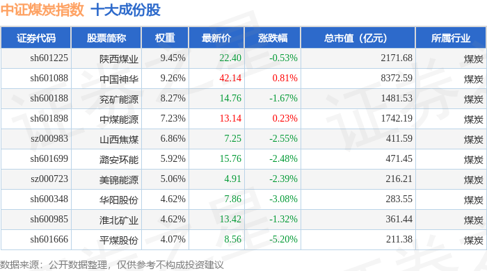 资金流向方面,中证煤炭(399998)指数成份股当日主力资金净流出合计12.51亿元,游资资金净流入合计2.06亿元,散户资金净流入合计10.45亿元。成份股资金流向详情见下表: