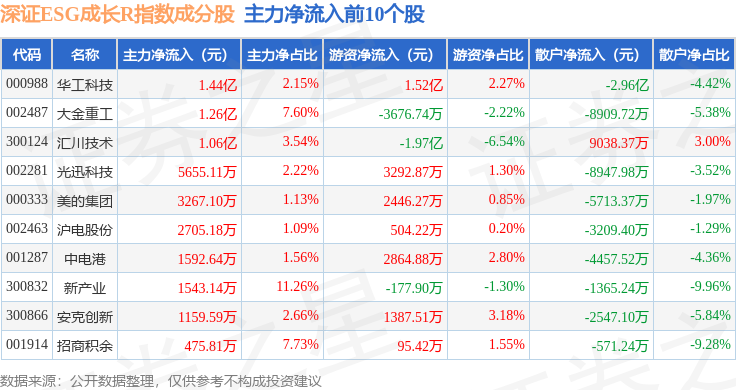资金流向方面,深证ESG成长R(470060)指数成份股当日主力资金净流出合计44.77亿元,游资资金净流入合计26.27亿元,散户资金净流入合计18.5亿元。成份股资金流向详情见下表:
